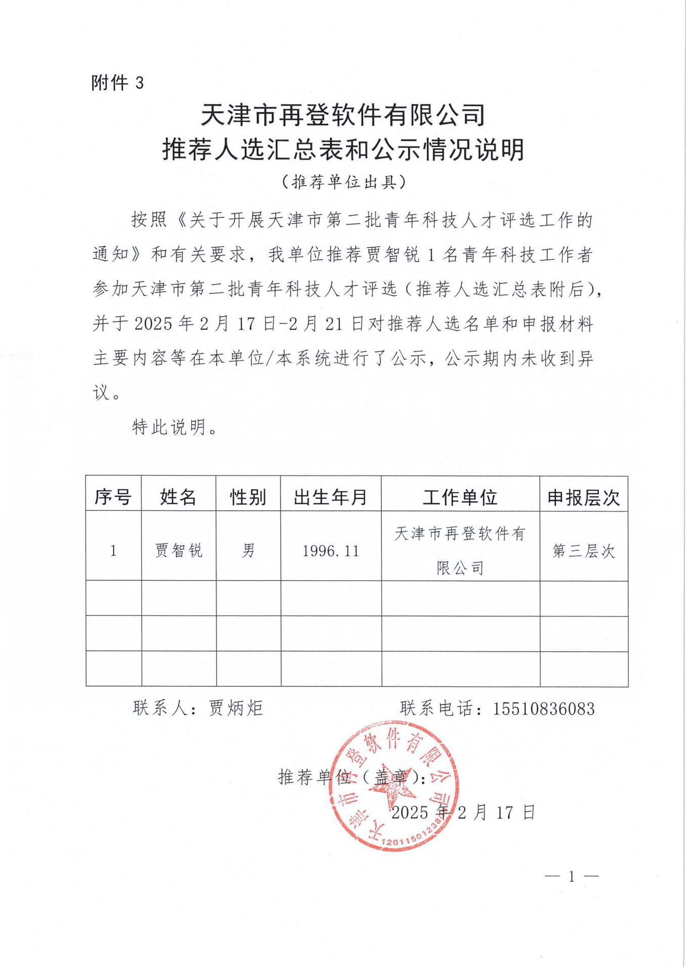 天津市再登软件有限公司推荐人选汇总表和公示情况说明